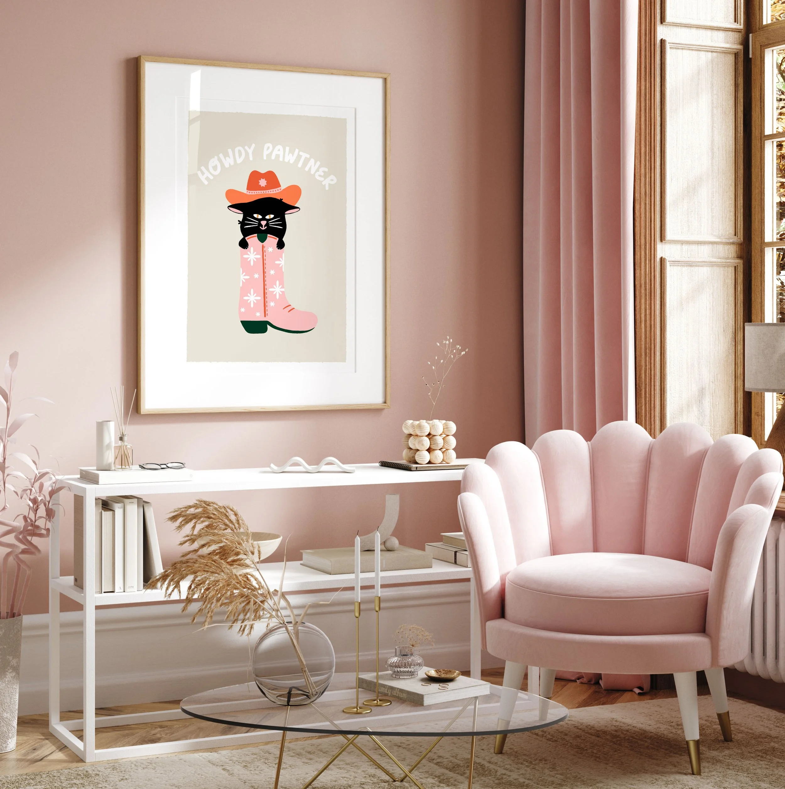 Howdy Pawtner! This cute cat print will bring a little joy to your walls. Who doesn't love a cute cat wearing a cowboy hat sitting in a cowboy boot?