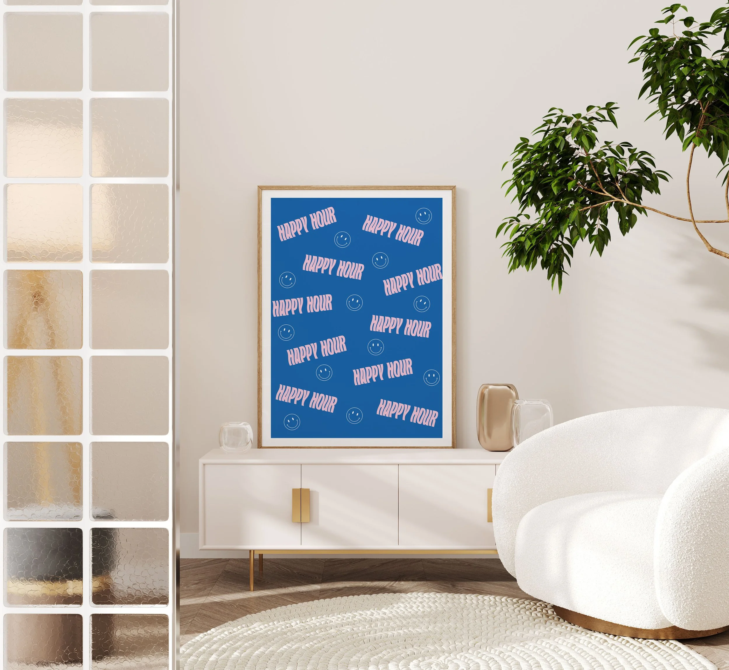 A wooden frame hangs on a white wall. The print inside is a blue and pink happy hour print. The words "Happy Hour" are in a wavy font.